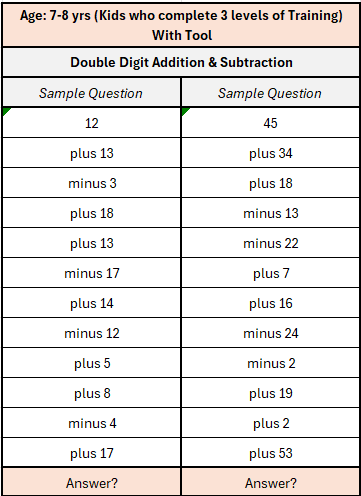 - Ability to do these arithmetic calculations without using a paper or a pen, just via visualization (which is the underlying secret of Abacus success).